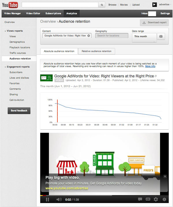 - Measure campaigns. YouTube Analytics provides useful unique viewer and video stats like views, audience retention, subscribers, viewer sources and demographics, call-to-action clicks, and mobile access. YouTube claims that video ads on its site drive a 20 percent increase in traffic to an advertiser’s website and a 5 percent increase in searches for an advertiser’s business.